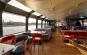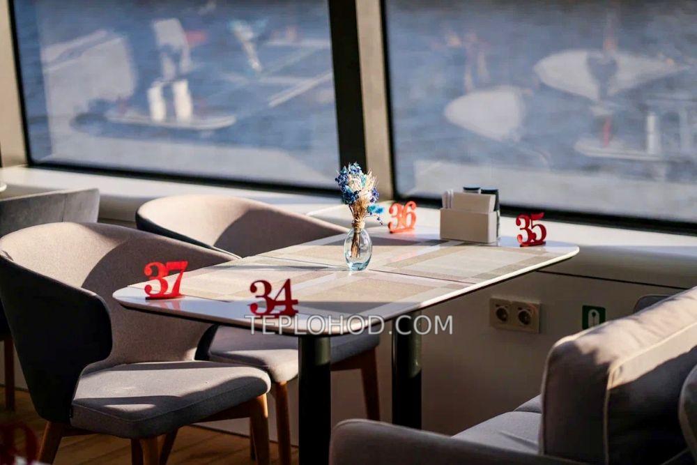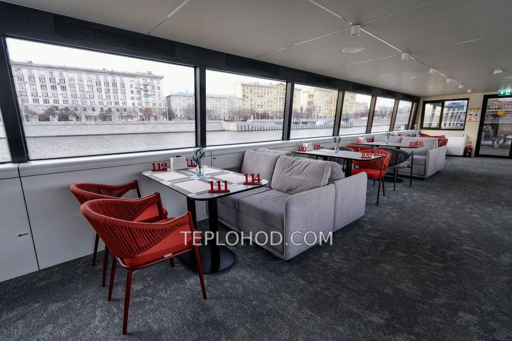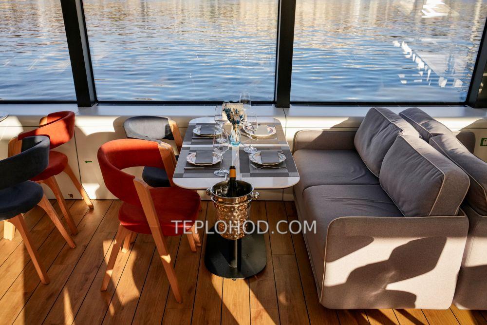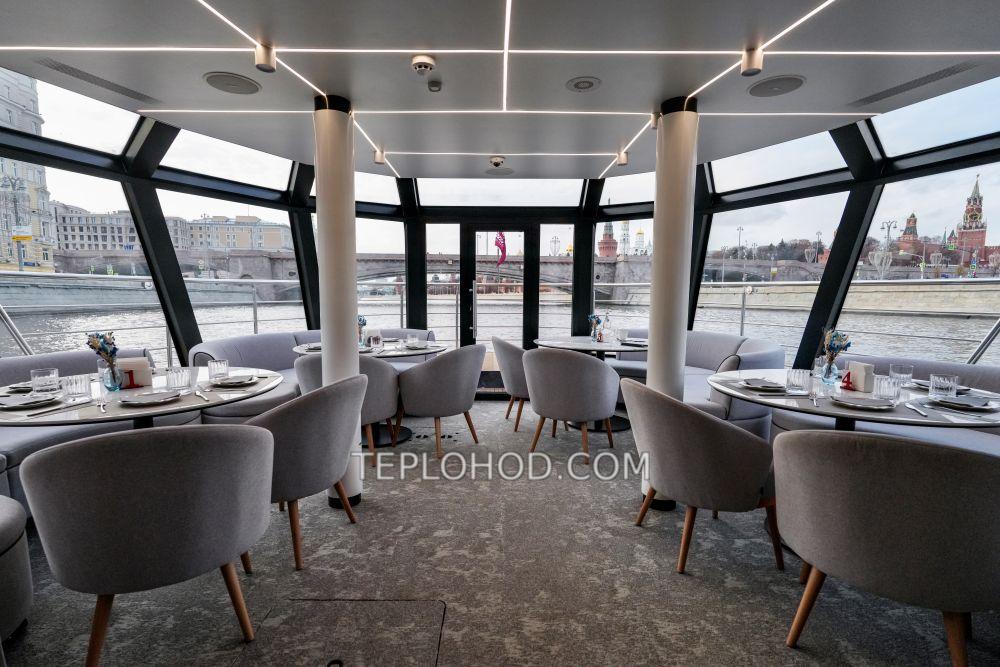 На главной палубе расположен просторный панорамный салон с мягкой подсветкой и продуманной зональностью. Здесь удобно разместиться как большой компании, так и небольшим группам пассажиров. В носовой части предусмотрена небольшая лаундж-зона, где можно отдохнуть в спокойной обстановке и наблюдать за движением по реке. На верхнюю палубу ведёт отдельный выход с кормы. Этот уровень частично открыт и идеально подходит для прогулок на свежем воздухе, фотосессий и созерцания панорам столицы.